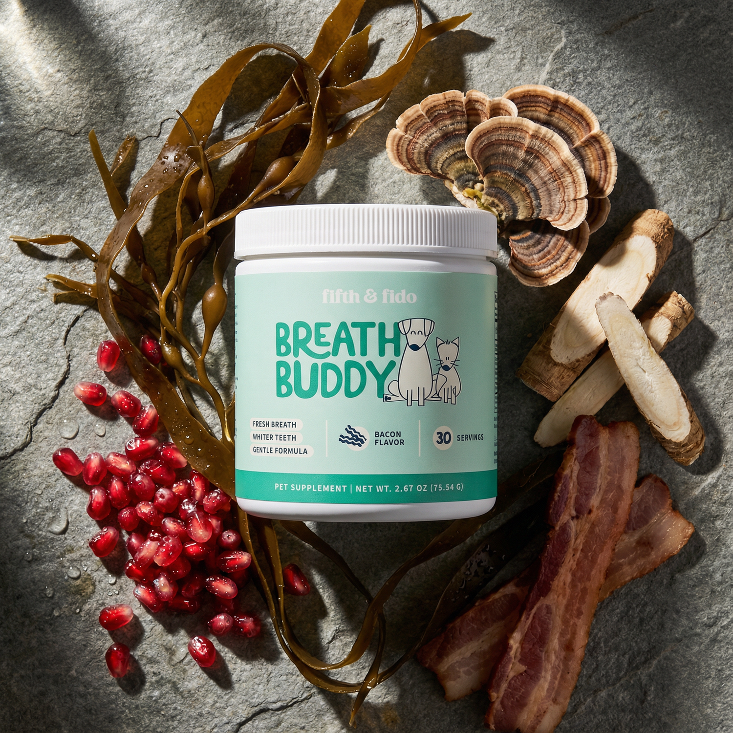 Our gentle formula combines brown algae, pomegranate, and gut-healing ingredients to support fresh breath and tartar control without upsetting sensitive stomachs.